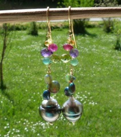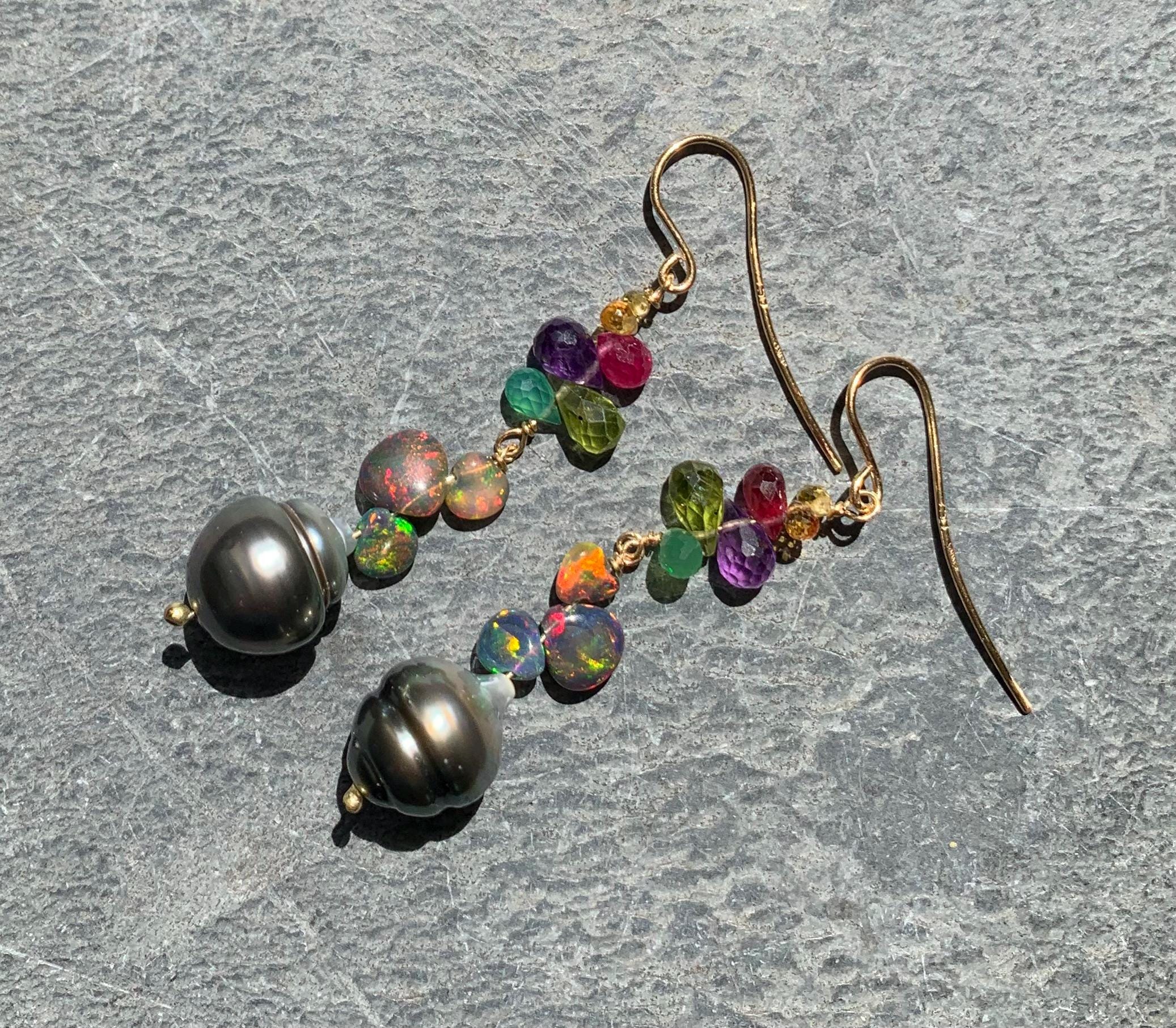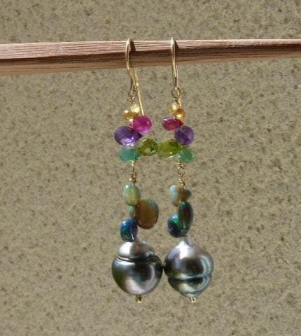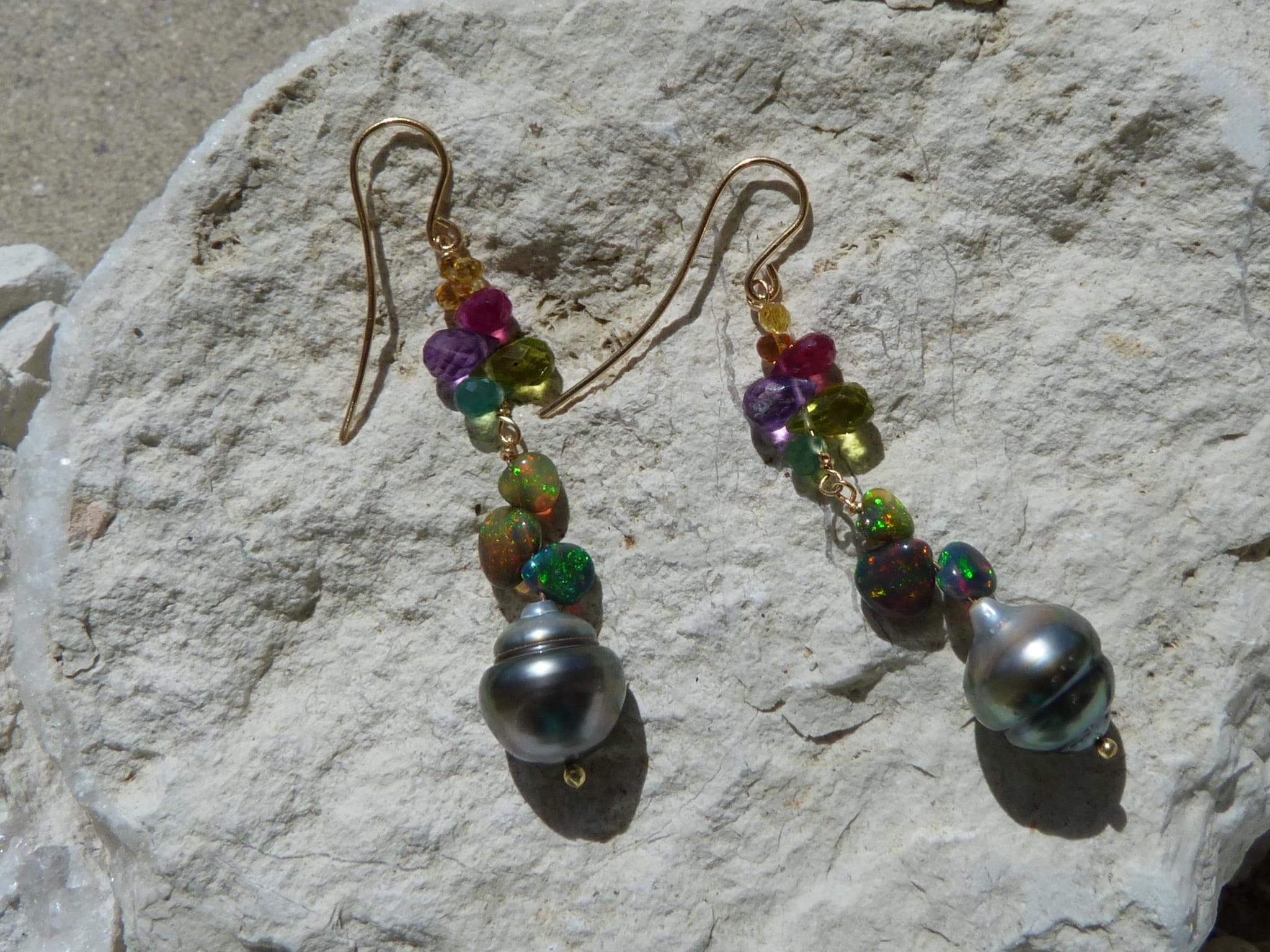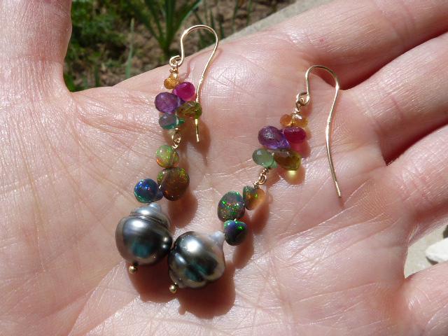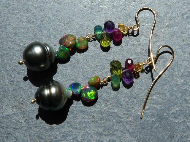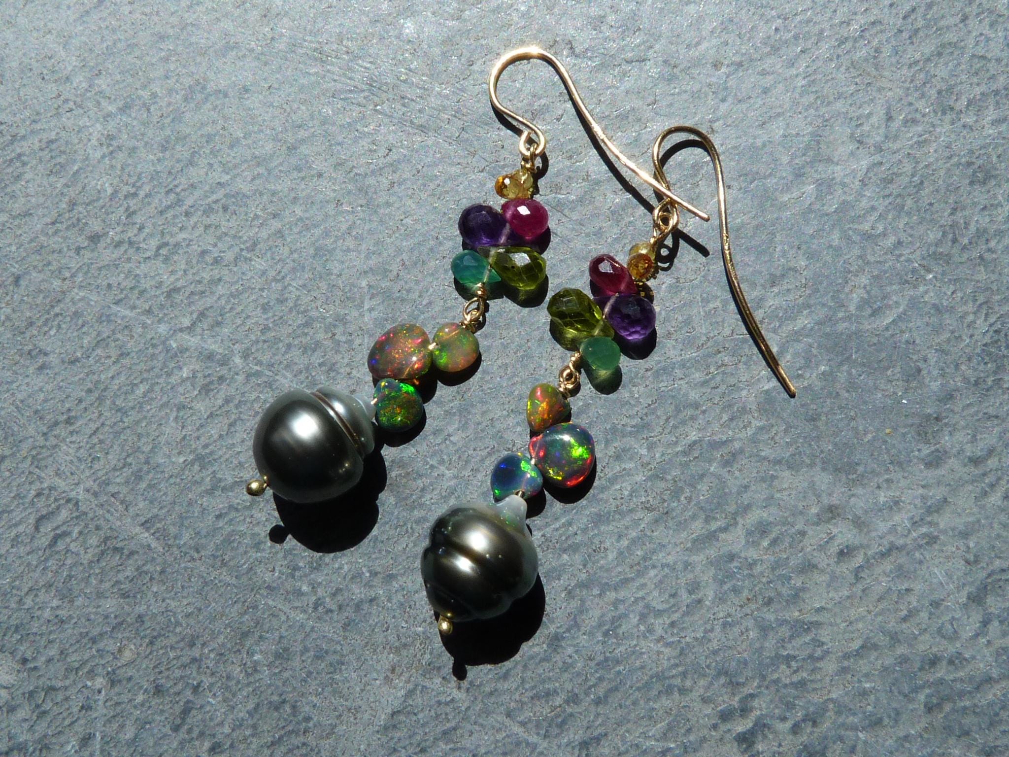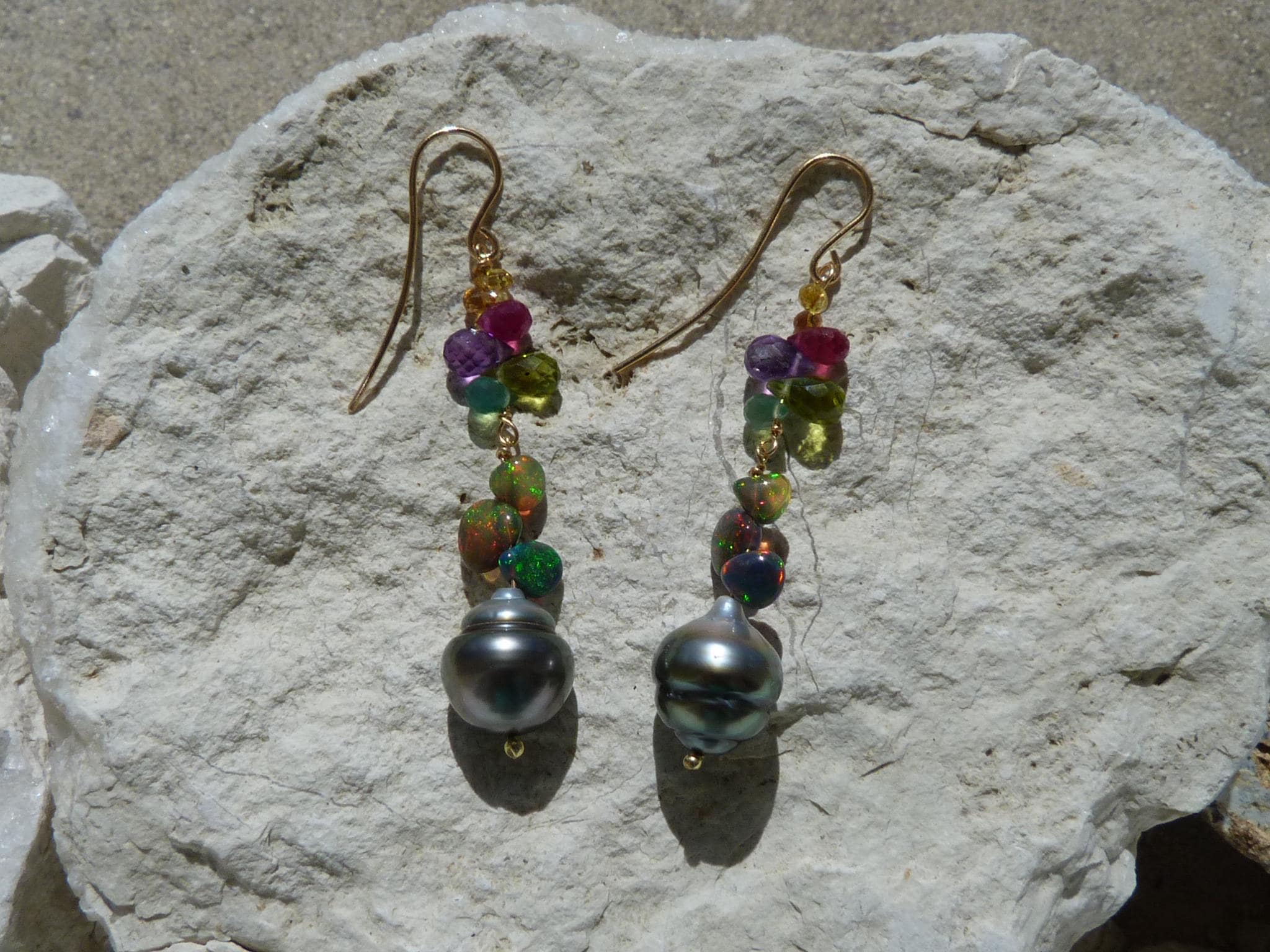 They are done in 18 kt yellow gold with precious stones ( ethiopian opals, sapphires, rubis, amethysts, peridots and aventurins ) and tahitien pearls.