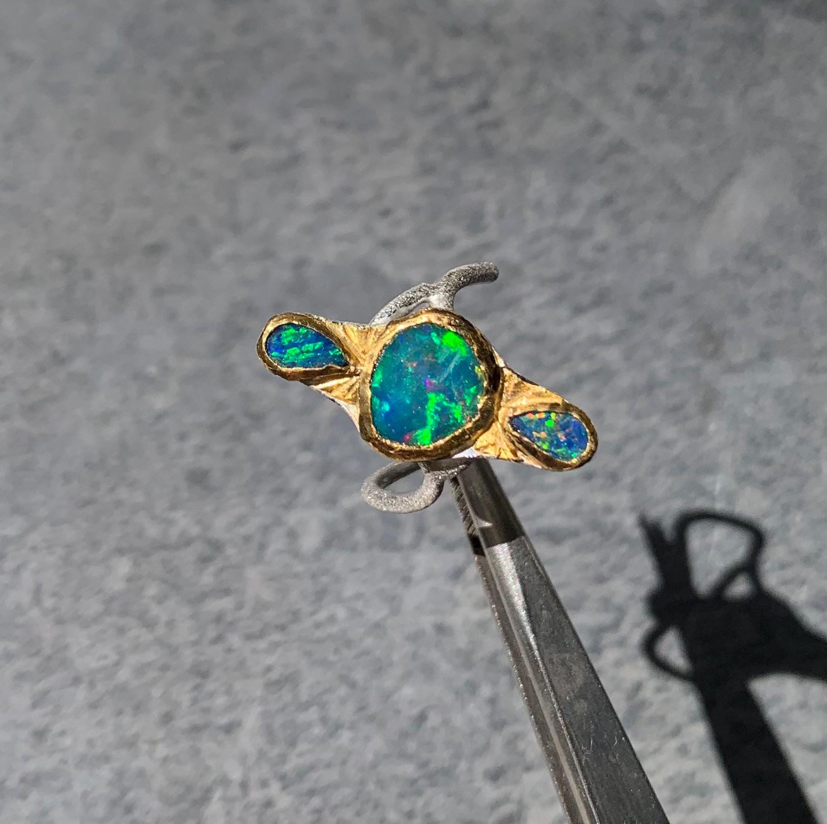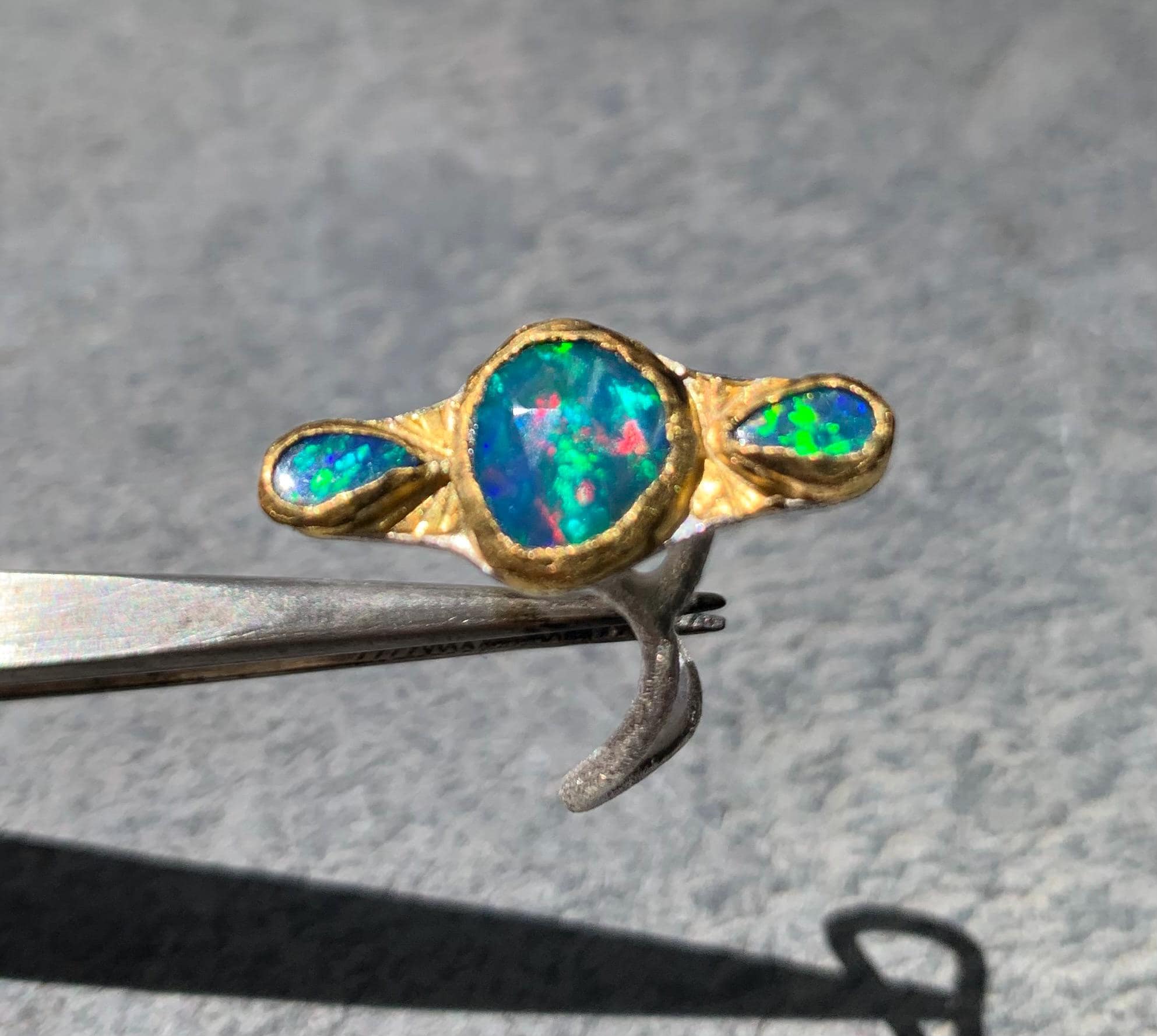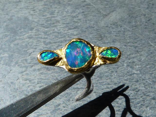 and 1 ethiopian opal 8,8 mm x 8 mm ( 0,85 ct ) which are setted in 24 k fine gold.